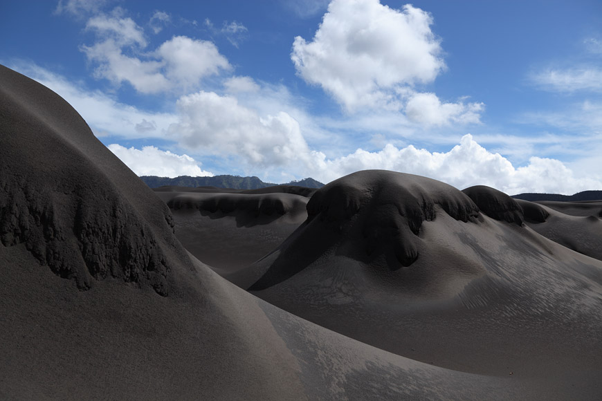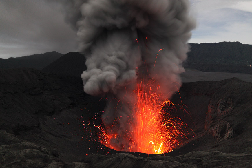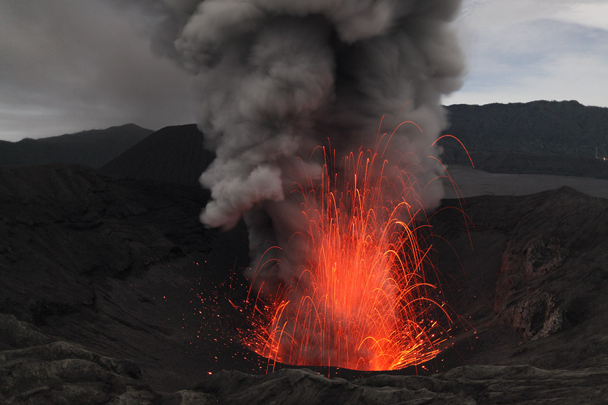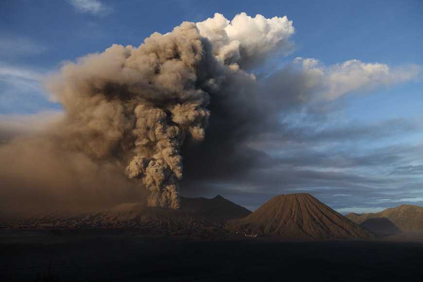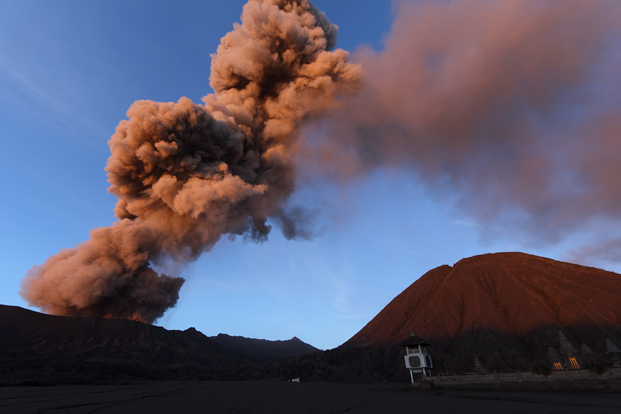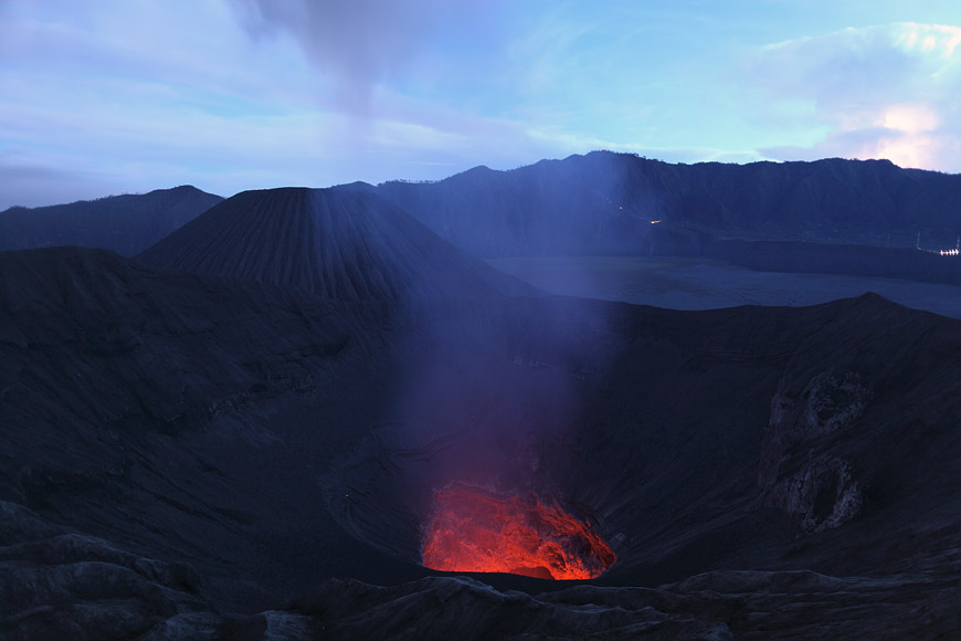 Bromo Temple below Mt. Batok (lower middle) gives scale
