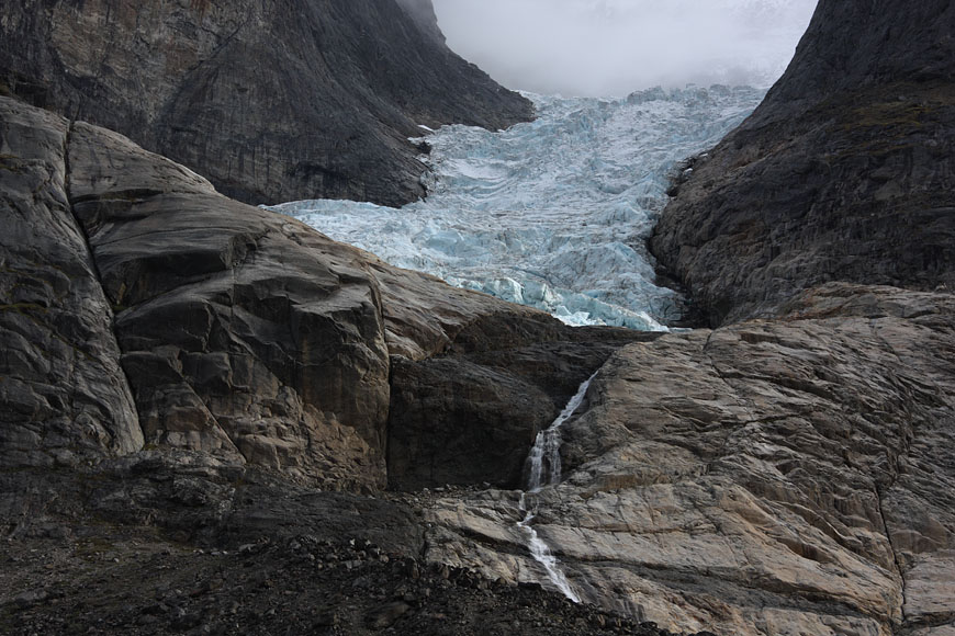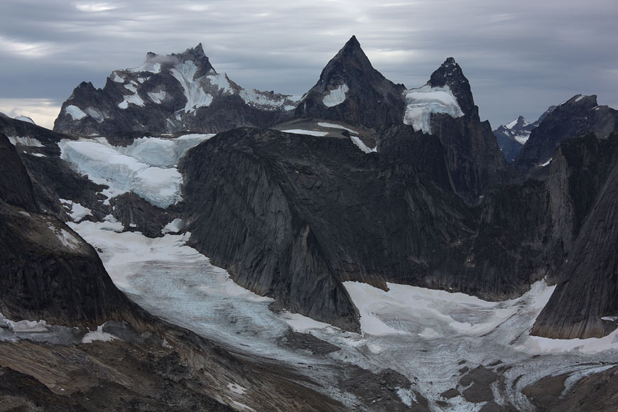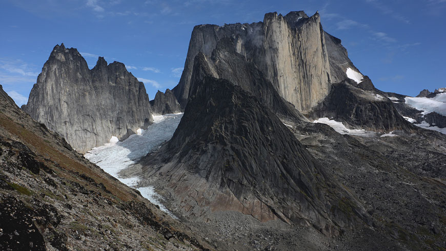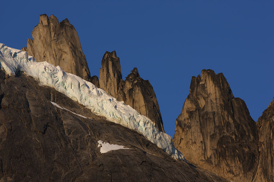 glaciers defying gravity on top of 1000m rock walls |