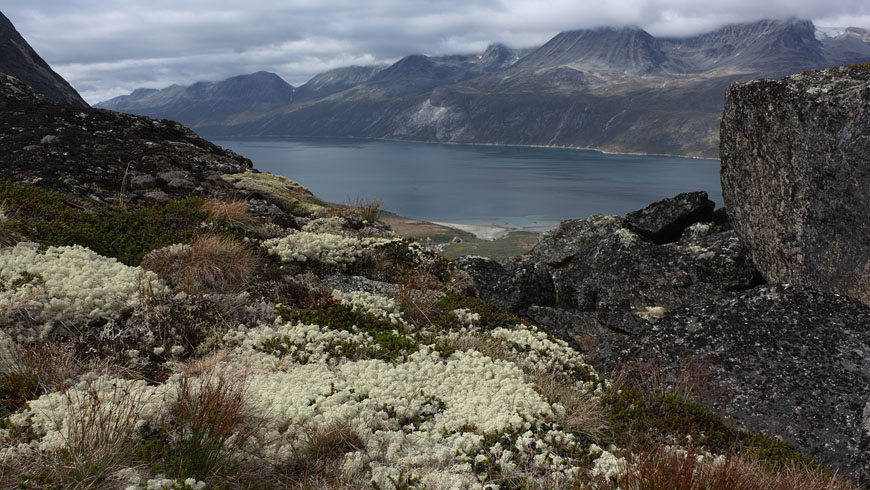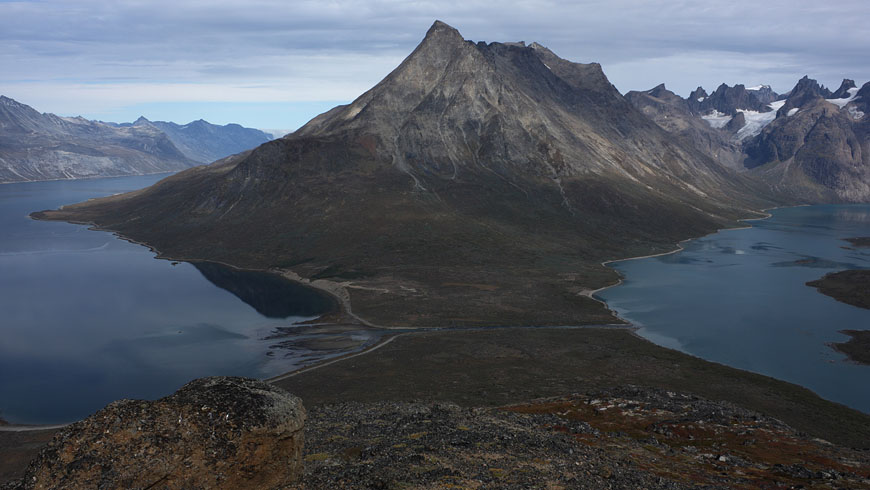 still nice weather and enough time to climb the Qaqqatsiaq mountain - giving a wonderful view to Tasersuaq lake and the Qinnguadalen far behind |