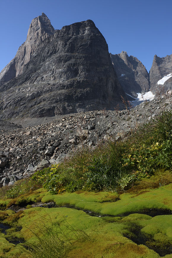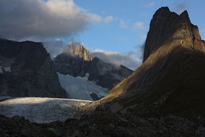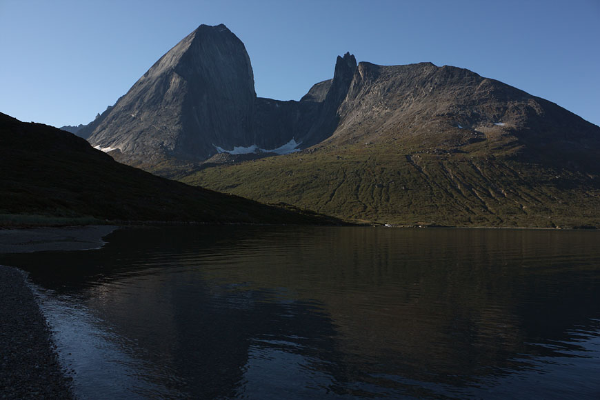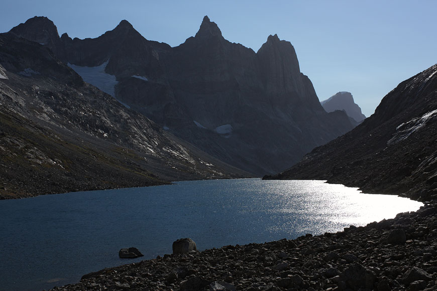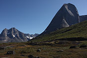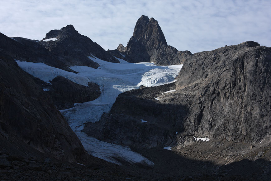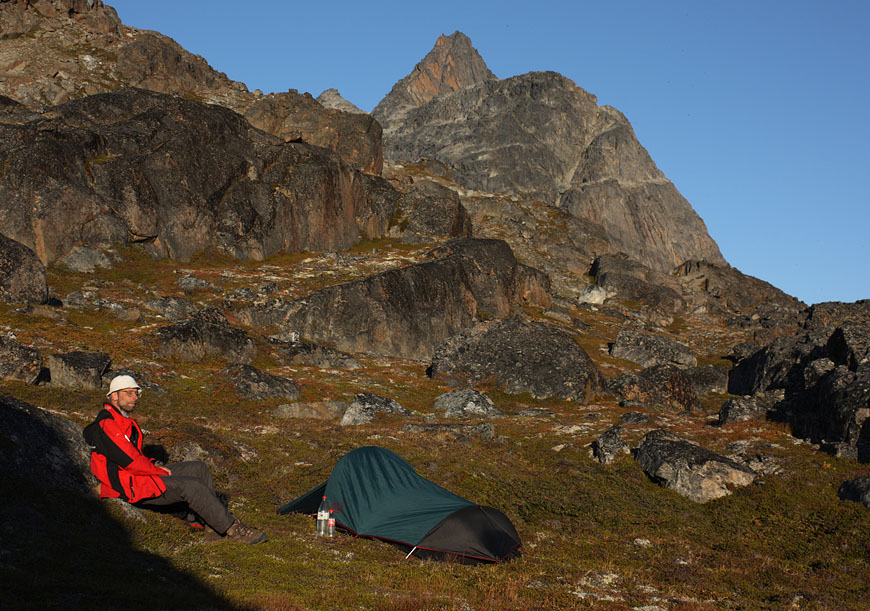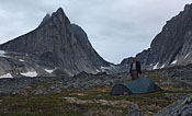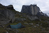 campsite after a long, strenuous day below towering Tininnertuup Qaqqaat summit, crossed pass behind |