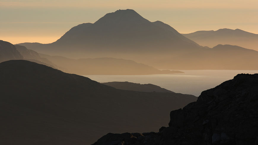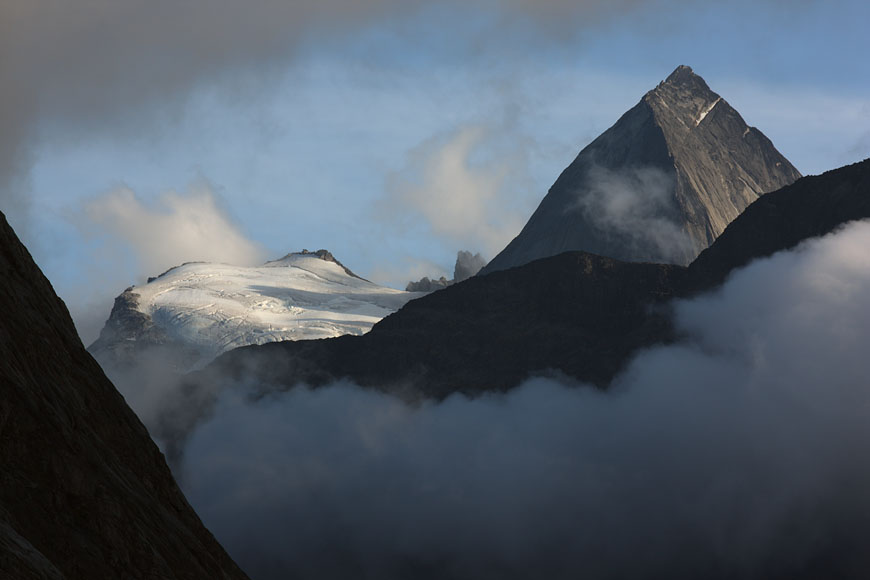 steep mountaintops catching first sunlight |
