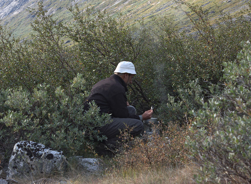 finding nice windcovered campsite used as basecamp for climbing excursion the following day |