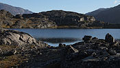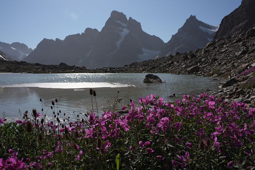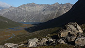 after reaching the upper Itillersuaq valley and beeing sure to reach the not too far away Inuit village I took another day off for climbing an unnamed 1100m peak having a beautiful sight back to the successfully crossed mountainrange with its colorful lakes |