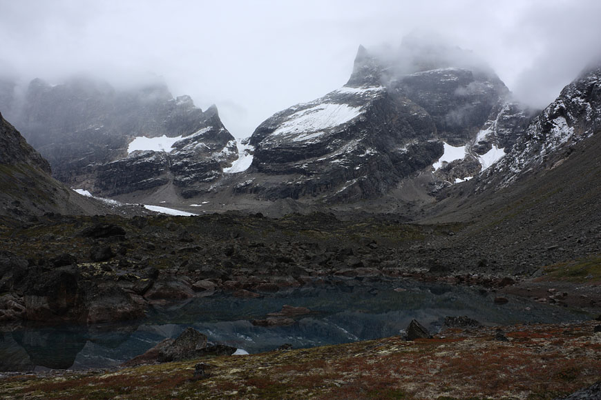 ascending to the next pass for reaching Qinnguadalen was easy, but circumnavigating its lake meant dealing with a dangerous steep and icy part |