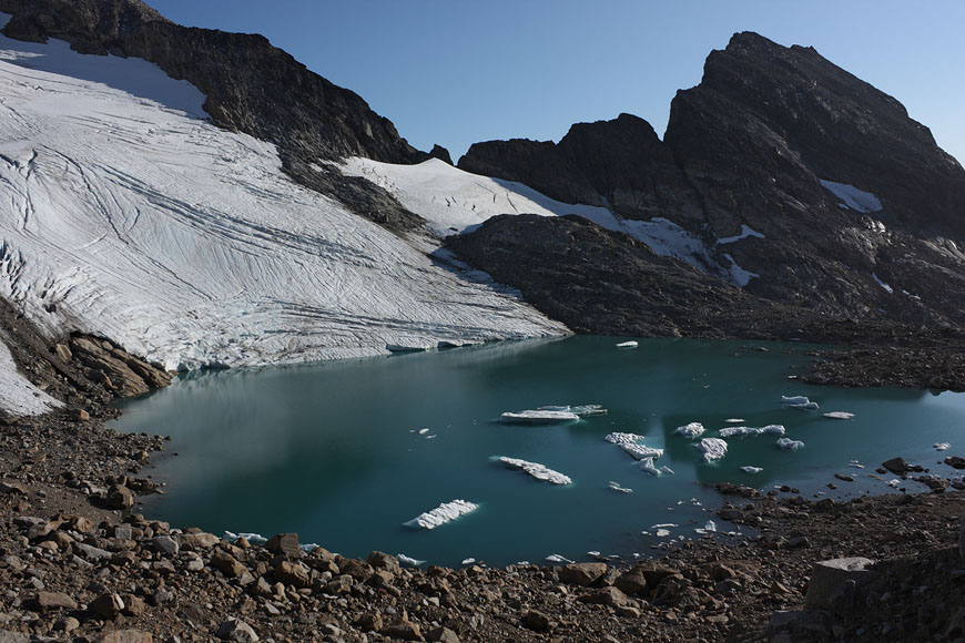 reaching glacier lake at the end of Qingeq kujalleq valley, but glacier retreat melted the expected glacierfront away...so turning back to the lake |