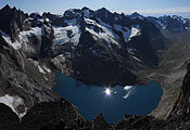 summit view to E showing unnamed lake 1000m directly below my feet, surrounded by steep mountains, seizable only with stitching multiple images |