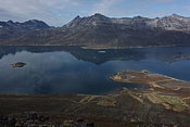 making extended walks around Nanortalik island, Nanortalic village below (mid of image) while waiting for chartered Inuit boat |