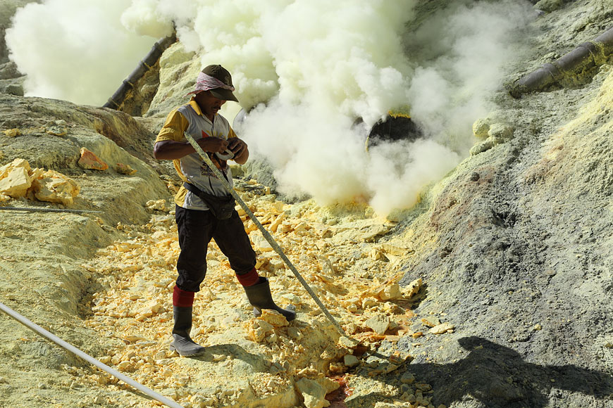 worker breaking sulfur deposits into pieces |