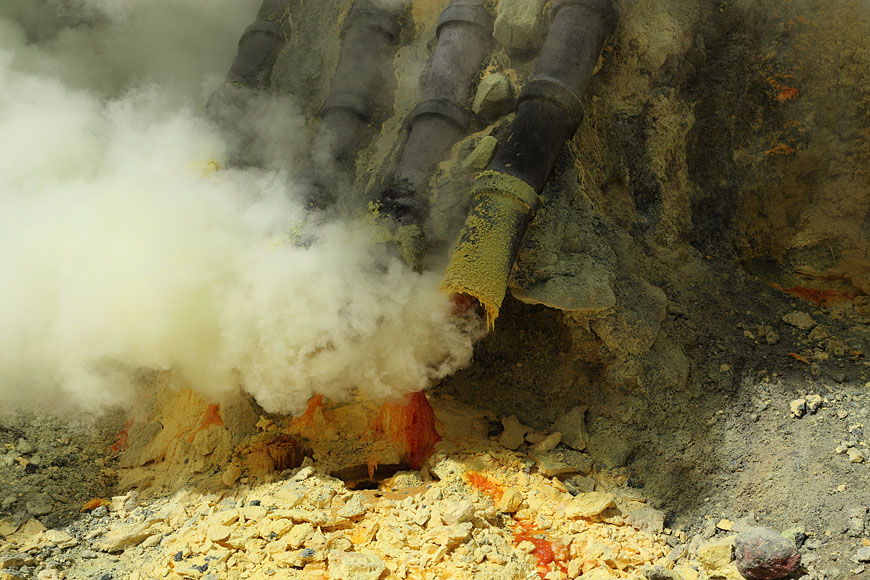 sulfur field with gas and steam rising above the crater |