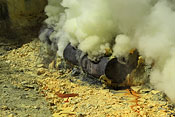 workers with sulfur baskets climbing the craters wall |