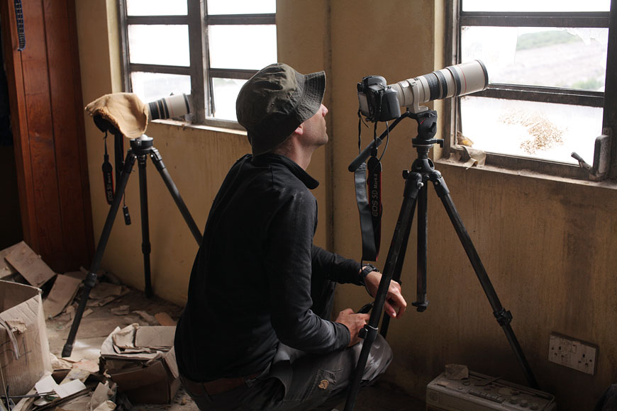 watching the volcano while covering from strong wind inside devastated house |
