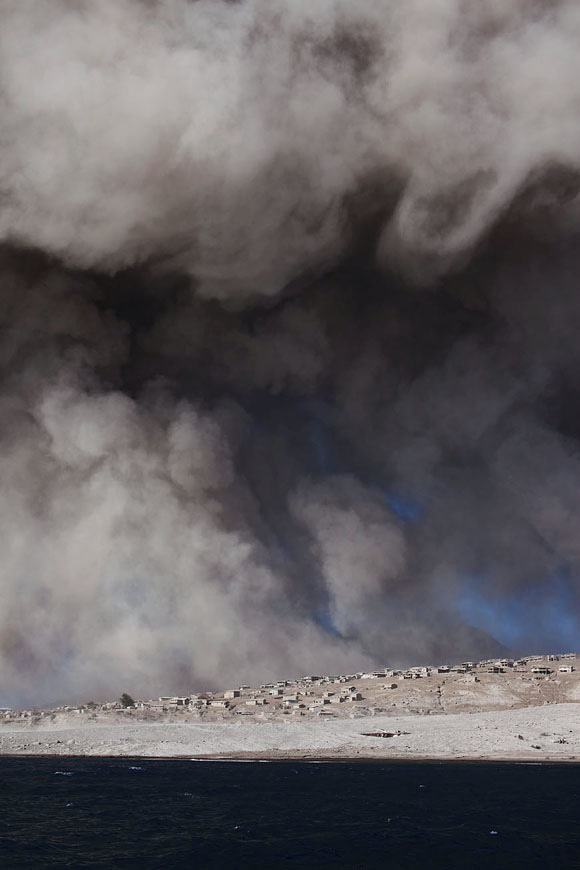 huge ash cloud above PF burned vegetation and houses |