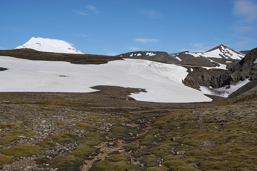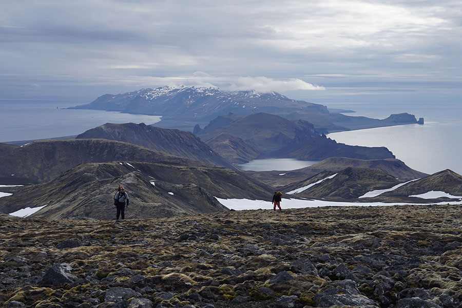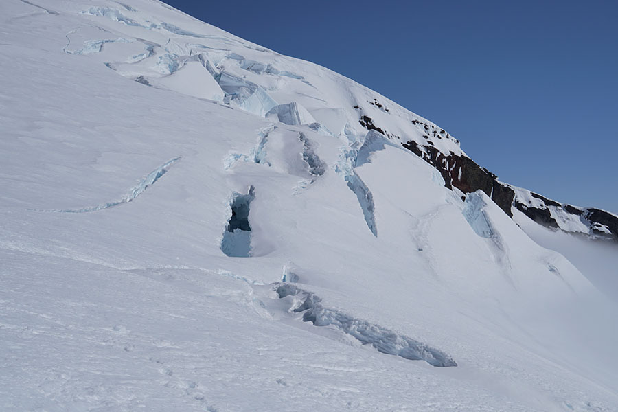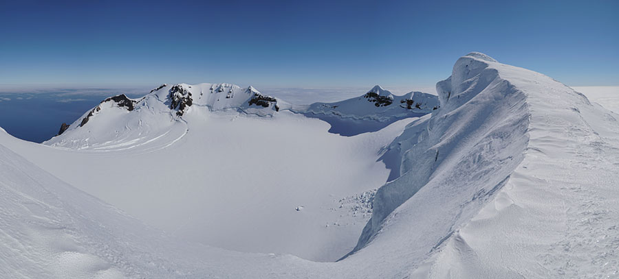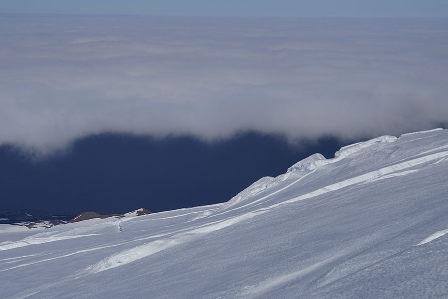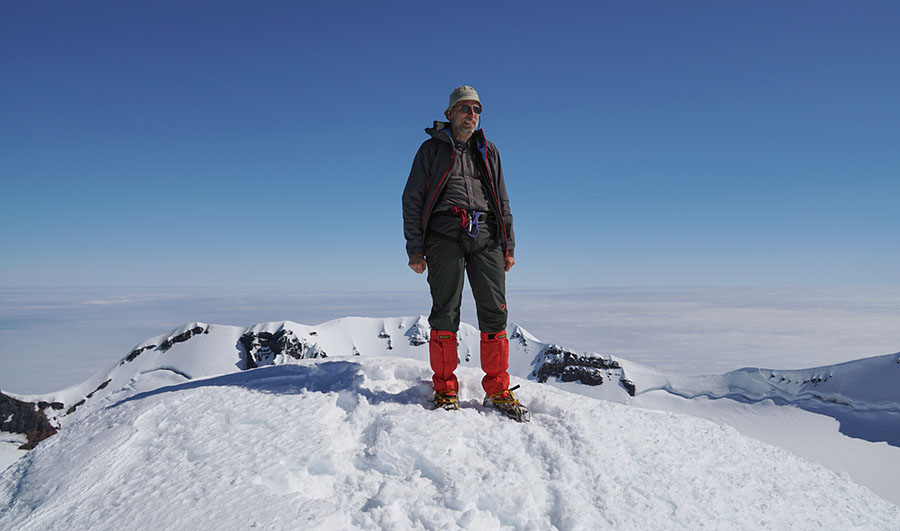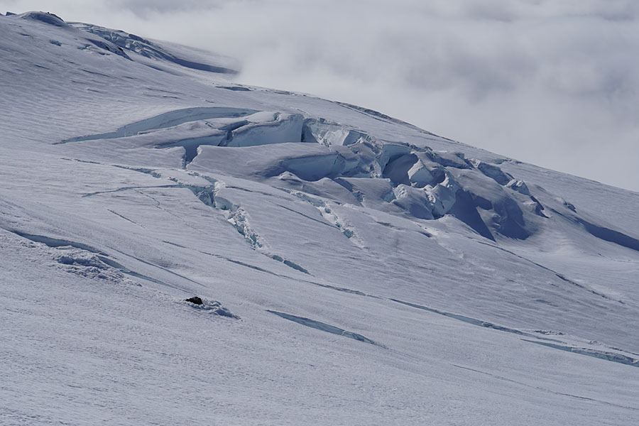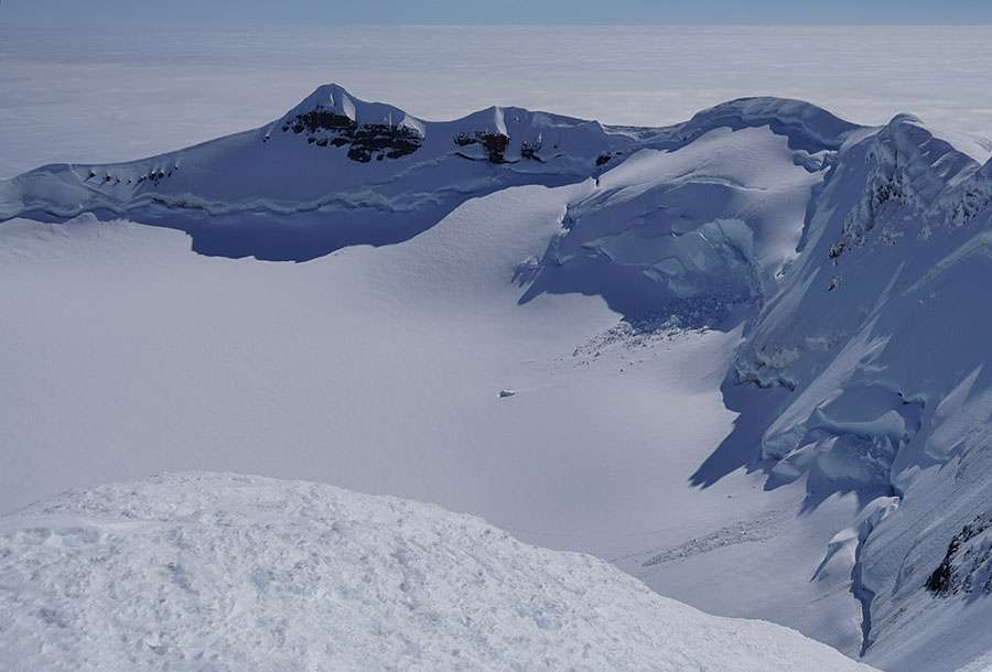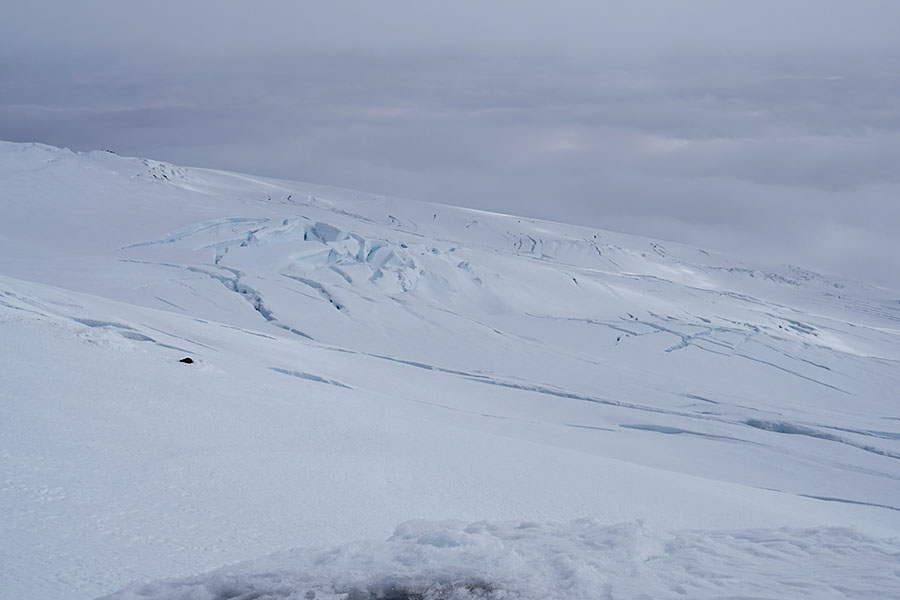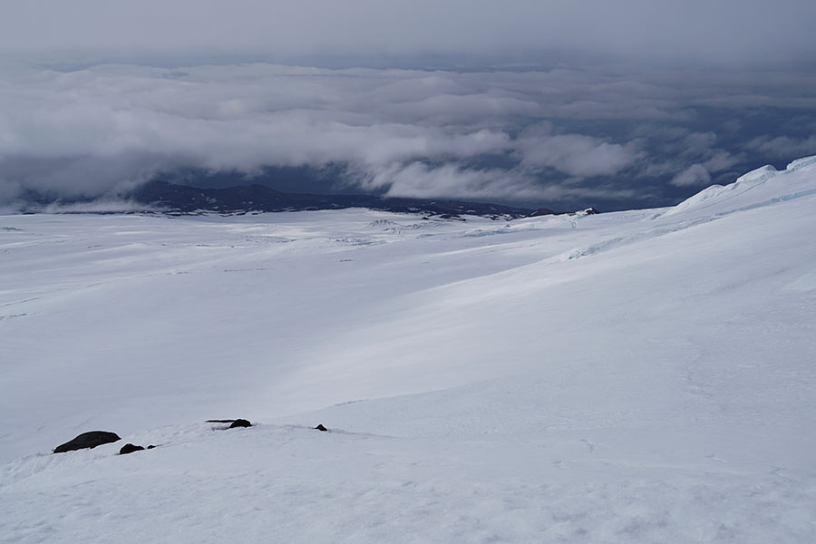 leaving Bergdalen behind our group alongside Sorlaguna heading for Beerenberg bypassing Soyla with our goal behind bypassing Nordlaguna view back to Nordlaguna climbing Beerenbergs S-flank climbing Beerenbergs S-flank Beerenberg still in far distance searching for a bivouac site near the snowline view back to the starting point this morning behind Kvalrossen (far to the right) fresh water is needed preparing bivouac for a few hours resting view down to Jan Mayen the next morning, inmidst of the seemingly endless Kronprins Olavs Breen glacier heading for the summit, now above cloudlevel Haakon VII (main summit in the background) above us  only 3 of us on the way to the summit crevassed terrain above cloud level finding our way through heavily crevassed terrain rime and icicle laden cliffs above the clouds crevassed S flank climbing steeper terrain crater ridge above us first view into summit crater summit crater panorama first view to main summit me on the very summit of Beerenberg, the highest point of the N atlantic view from Haakon VII (main summit) down to the Weyprechtbreen and W coast view back to the recently climbed crater ridge full crater panorama, Weyprechtbreen to the left upper part of Weyprechtbreen crater rim W part of crater W part of crater looking down the Weyprechtbreen climbing down the same way view back Haakon VII (main summit) behind crevasse slalom on the way back crevasse slalom on the way back diving into cloud level again seemingly endless glacier crossing in weak midday snow further down into the clouds bypassing Pukkelryggen on the way back, arriving at campsite  around 11pm after approx. 20h of nearly nonstop walking