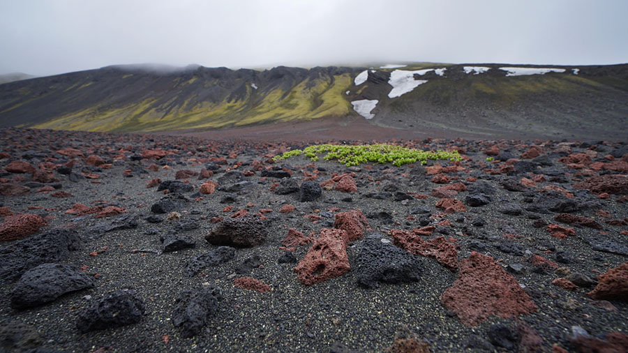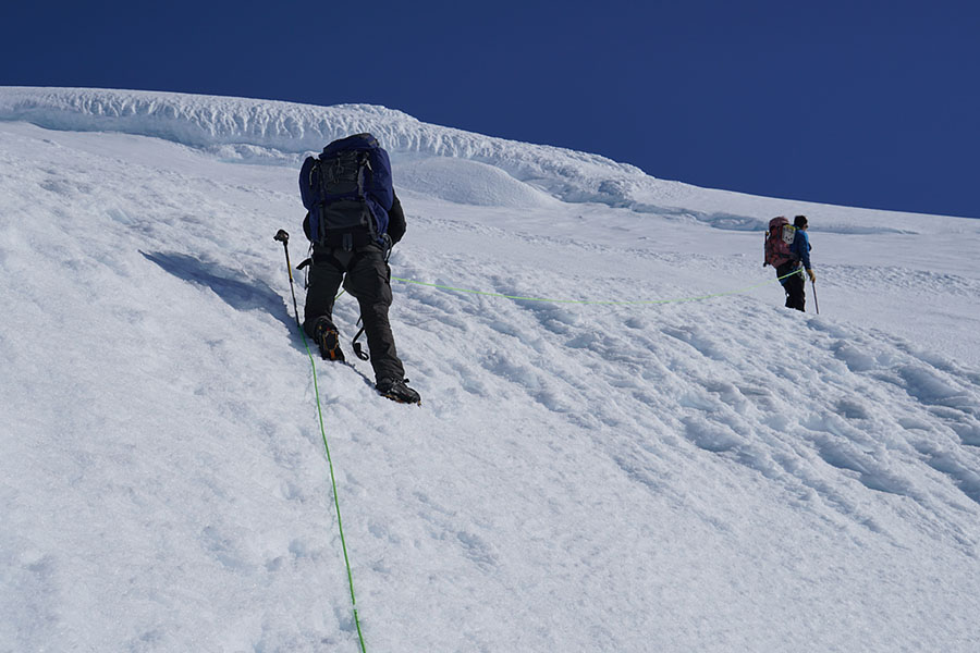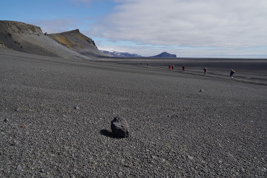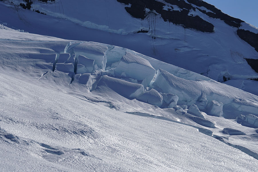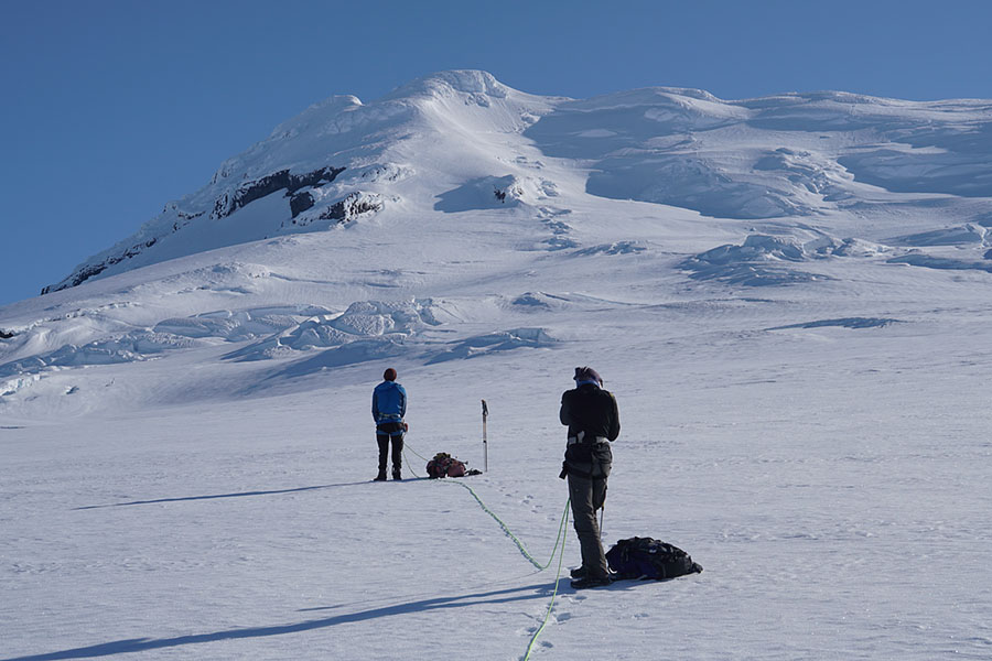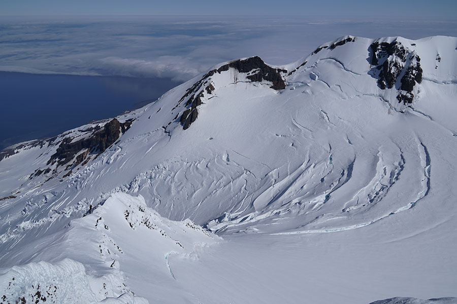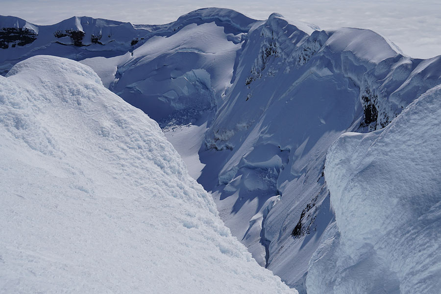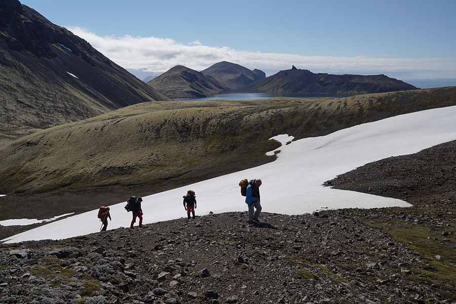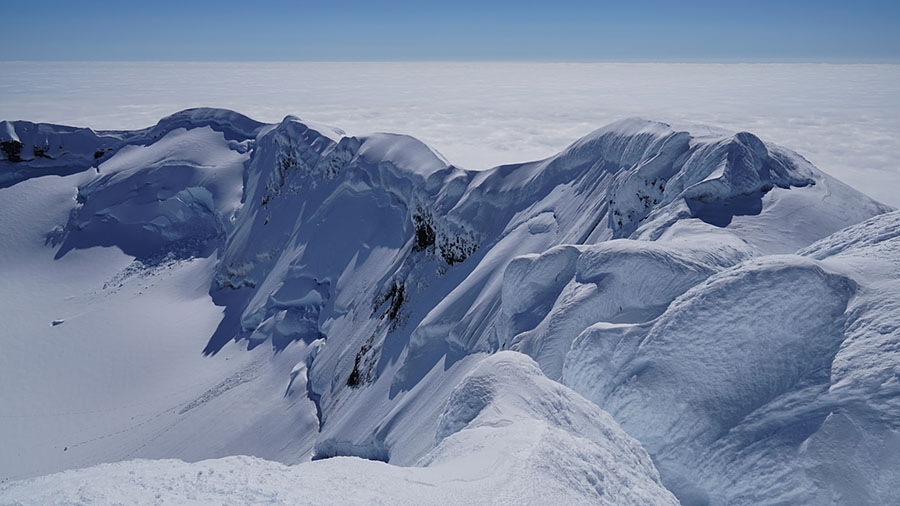 leaving Bergdalen behind our group alongside Sorlaguna heading for Beerenberg bypassing Soyla with our goal behind bypassing Nordlaguna view back to Nordlaguna climbing Beerenbergs S-flank climbing Beerenbergs S-flank Beerenberg still in far distance searching for a bivouac site near the snowline view back to the starting point this morning behind Kvalrossen (far to the right) fresh water is needed preparing bivouac for a few hours resting view down to Jan Mayen the next morning, inmidst of the seemingly endless Kronprins Olavs Breen glacier heading for the summit, now above cloudlevel Haakon VII (main summit in the background) above us  only 3 of us on the way to the summit crevassed terrain above cloud level finding our way through heavily crevassed terrain rime and icicle laden cliffs above the clouds crevassed S flank climbing steeper terrain crater ridge above us first view into summit crater summit crater panorama first view to main summit me on the very summit of Beerenberg, the highest point of the N atlantic view from Haakon VII (main summit) down to the Weyprechtbreen and W coast view back to the recently climbed crater ridge full crater panorama, Weyprechtbreen to the left upper part of Weyprechtbreen crater rim W part of crater W part of crater looking down the Weyprechtbreen climbing down the same way view back Haakon VII (main summit) behind crevasse slalom on the way back crevasse slalom on the way back diving into cloud level again seemingly endless glacier crossing in weak midday snow further down into the clouds bypassing Pukkelryggen on the way back, arriving at campsite  around 11pm after approx. 20h of nearly nonstop walking